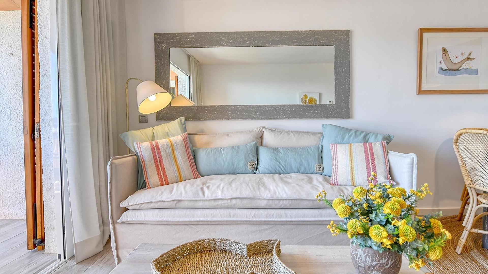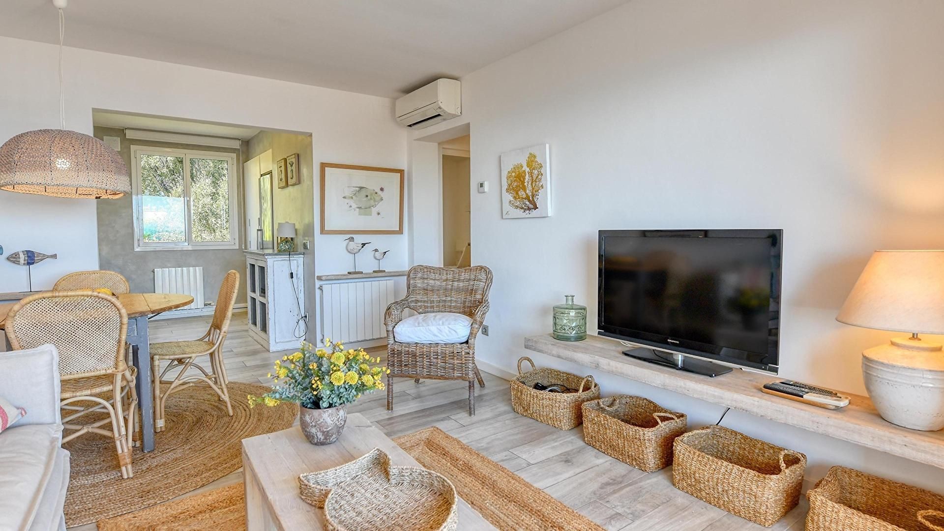 - Living/dining room, television, access to the terrace, air conditionning and heating unit and sea view.