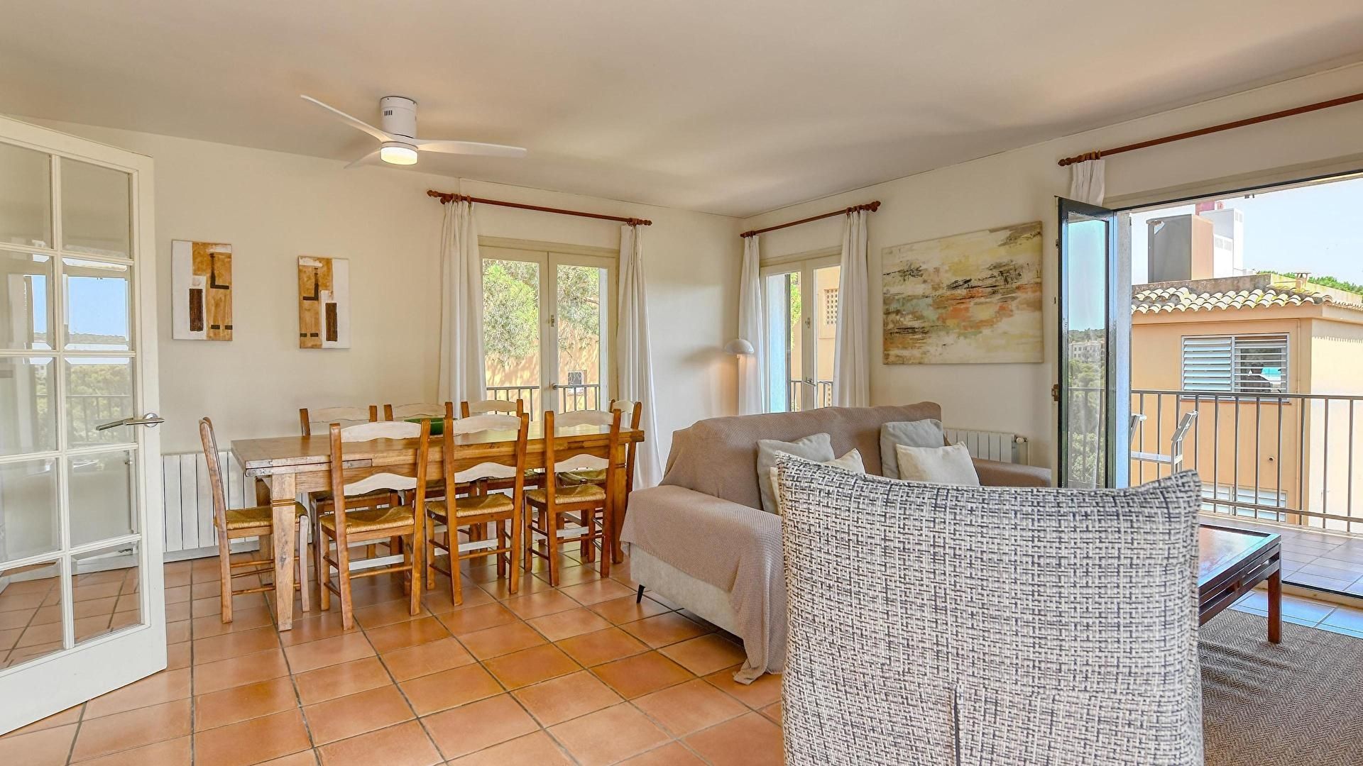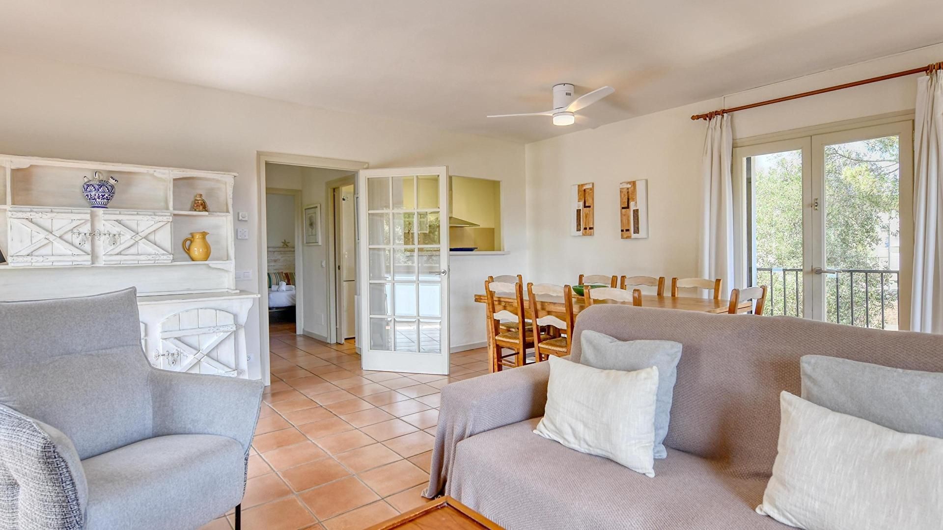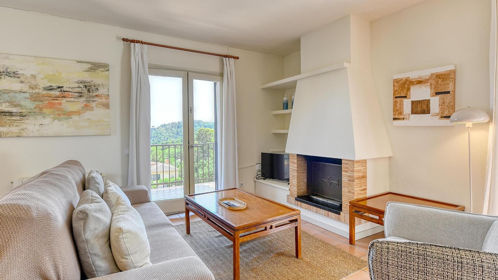 - Living/dining room with access to the terrace, fire place, television and ceiling fan.