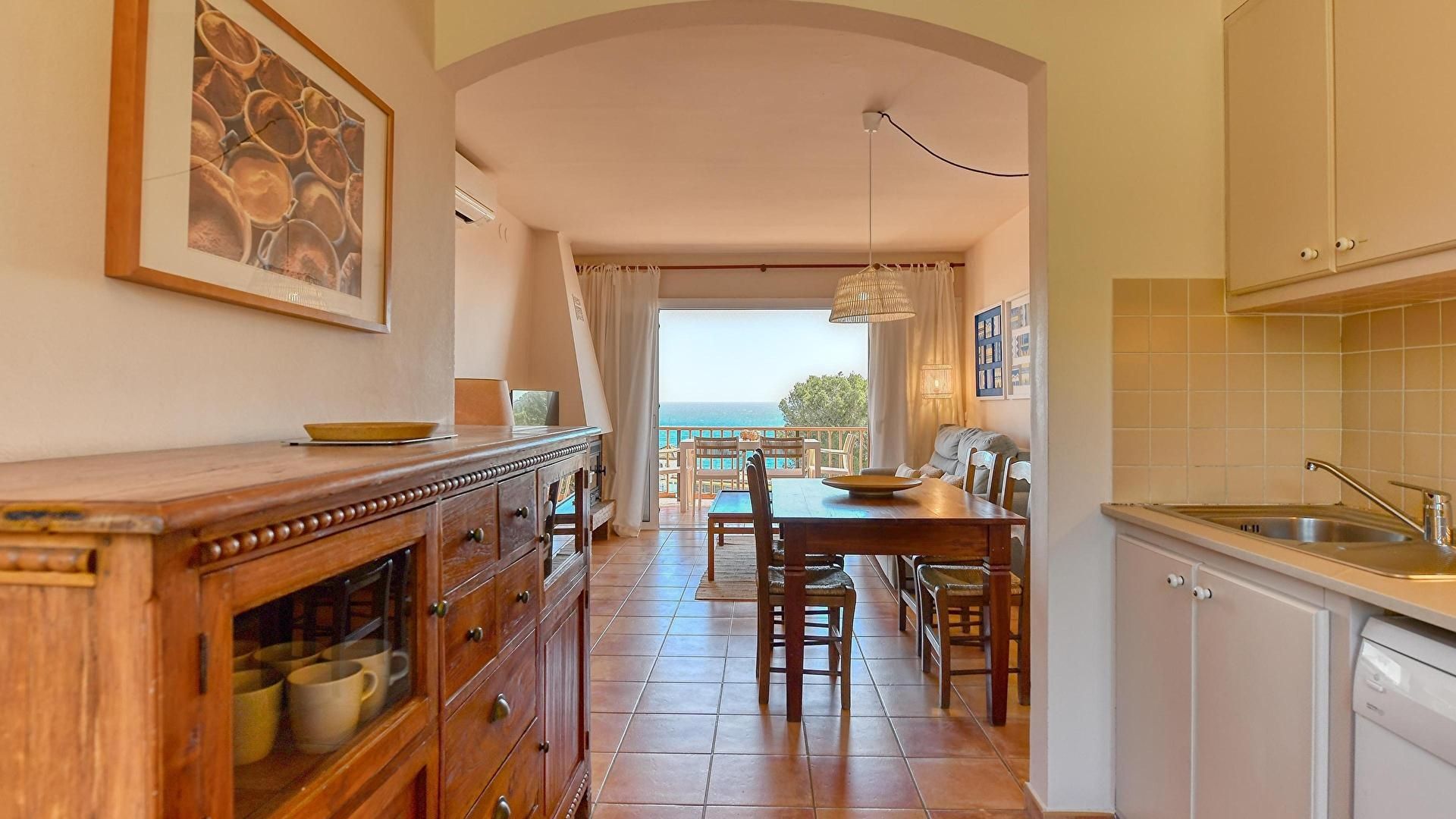 - Open american style kitchen with ceramic hobb, oven, microwave, fridge, dishwasher, washing machine and sea view.