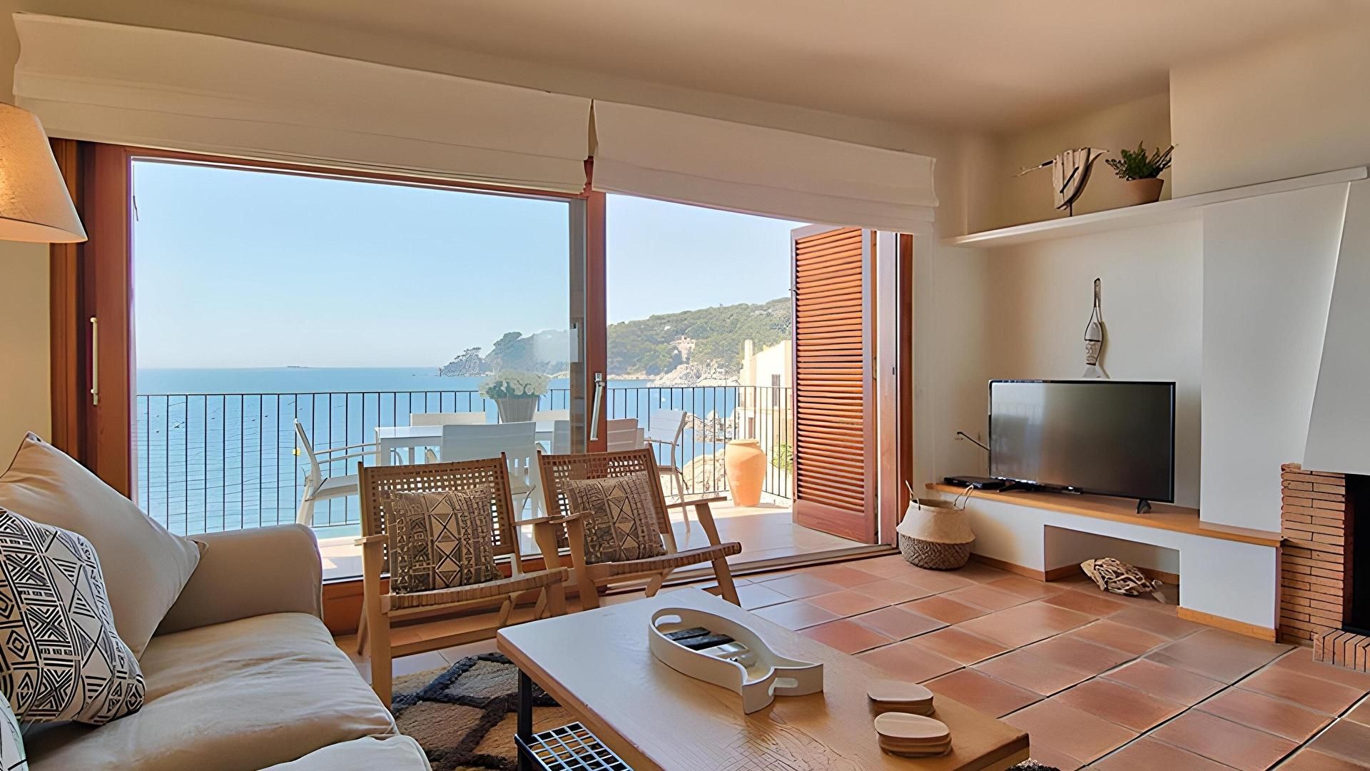 - Living/dining room with fire place, television, independent air conditionning and hot air units, access to the terrace and sea view.